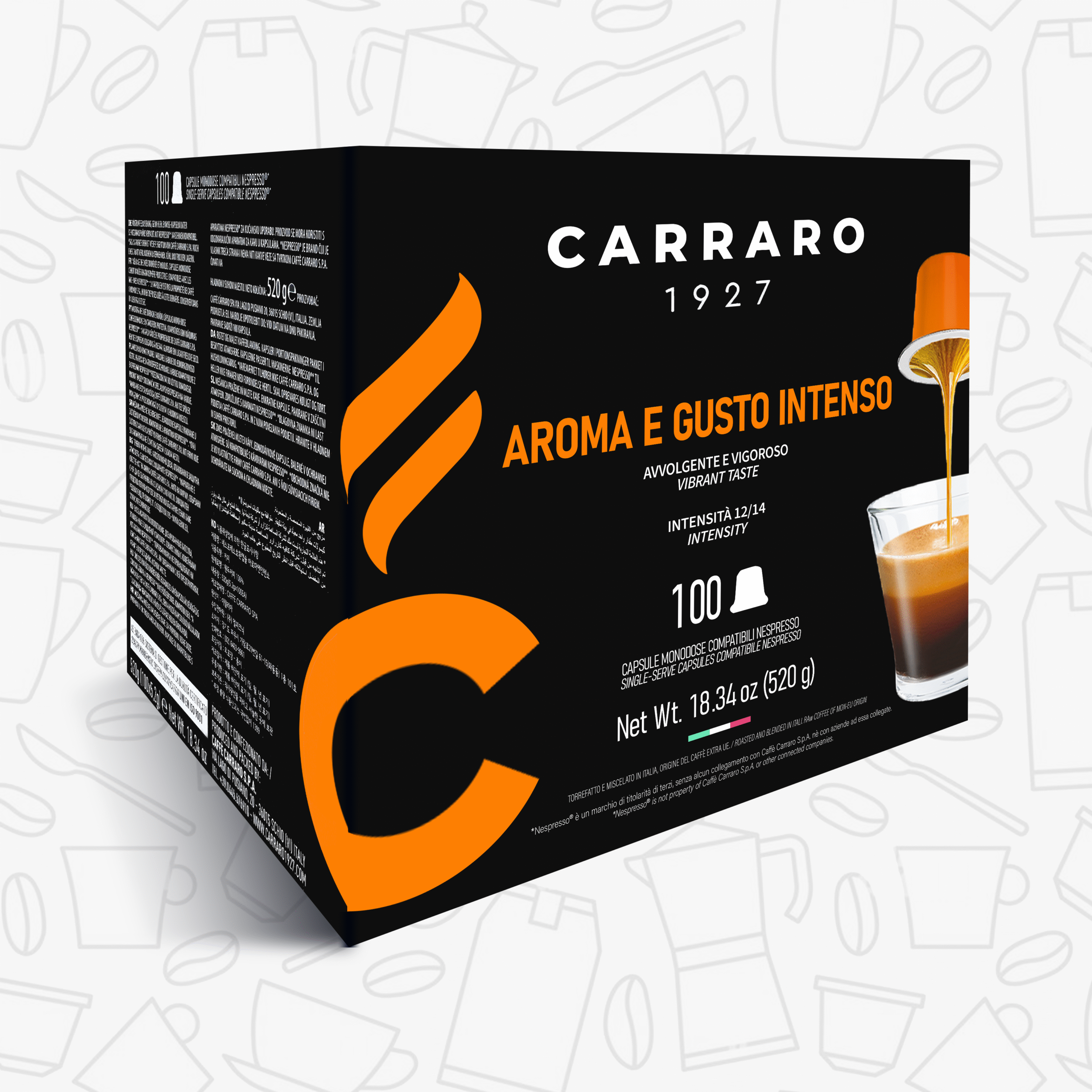 The AROMA E GUSTO INTENSO Coffee Capsules from Carraro are compatible with NESPRESSO®* machines and offer a bold and intense flavor.